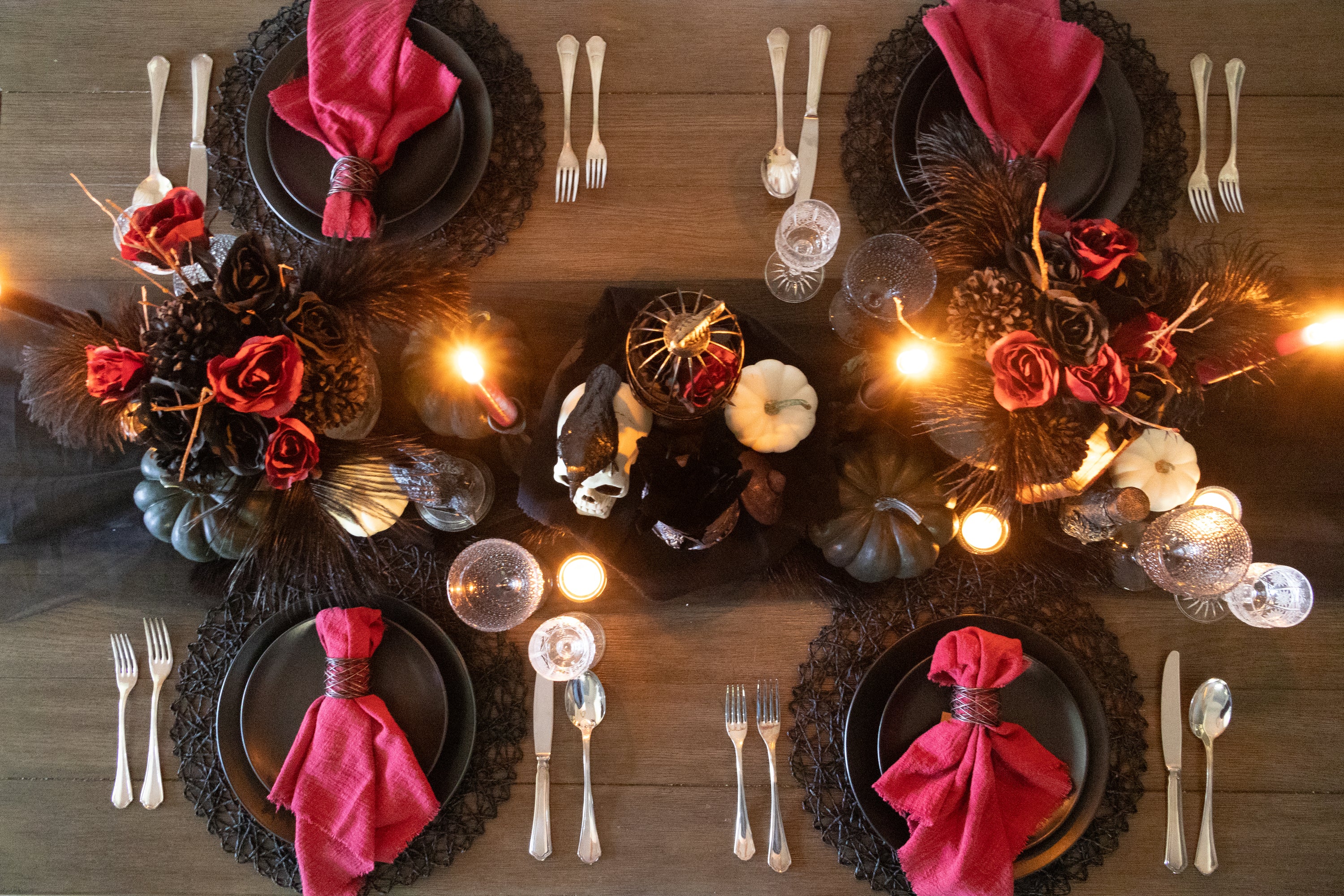 A dark and dramatic setup featuring moody tones, vintage details, and eerie elegance—perfect for a sophisticated, spooky Halloween tablescape.