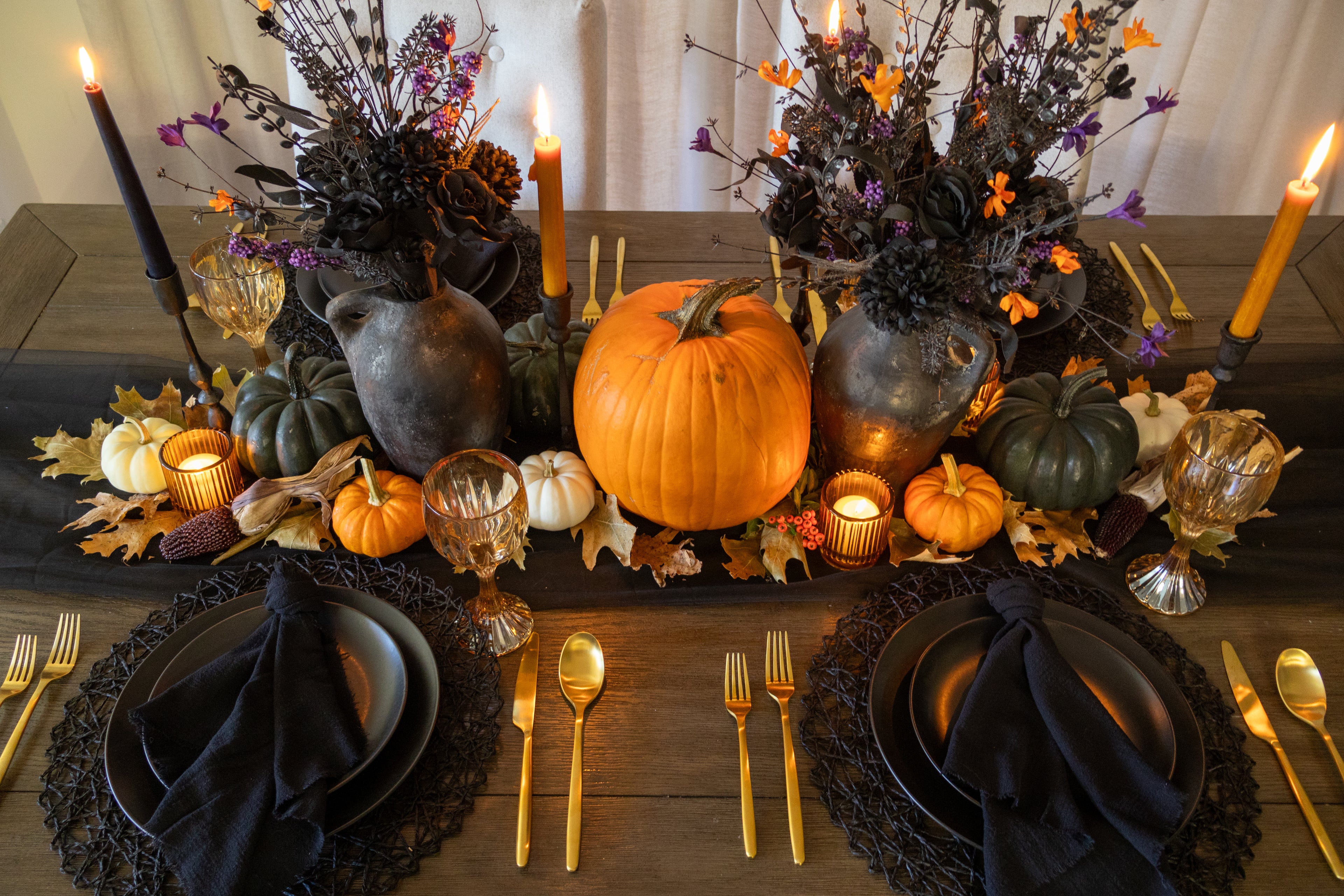 A moody autumn setup with deep tones, soft candlelight, and seasonal accents—perfect for a dark, elegant autumn gathering.