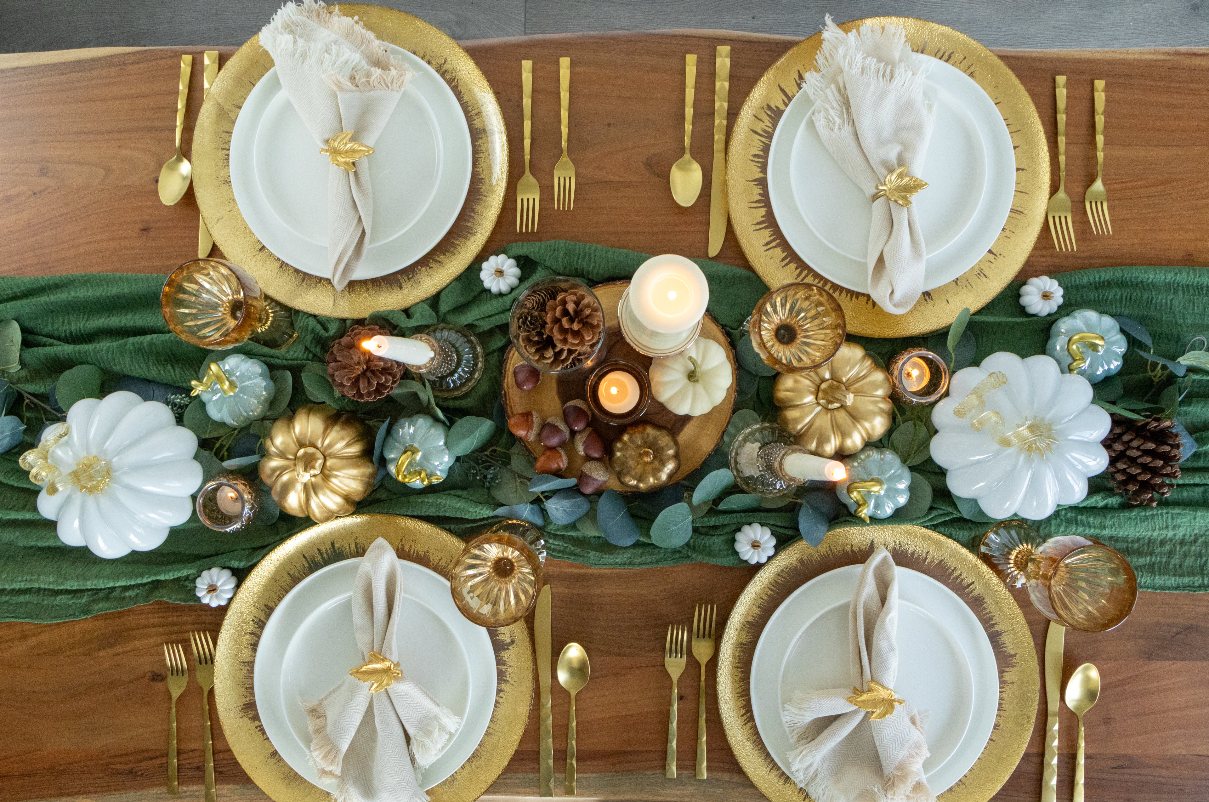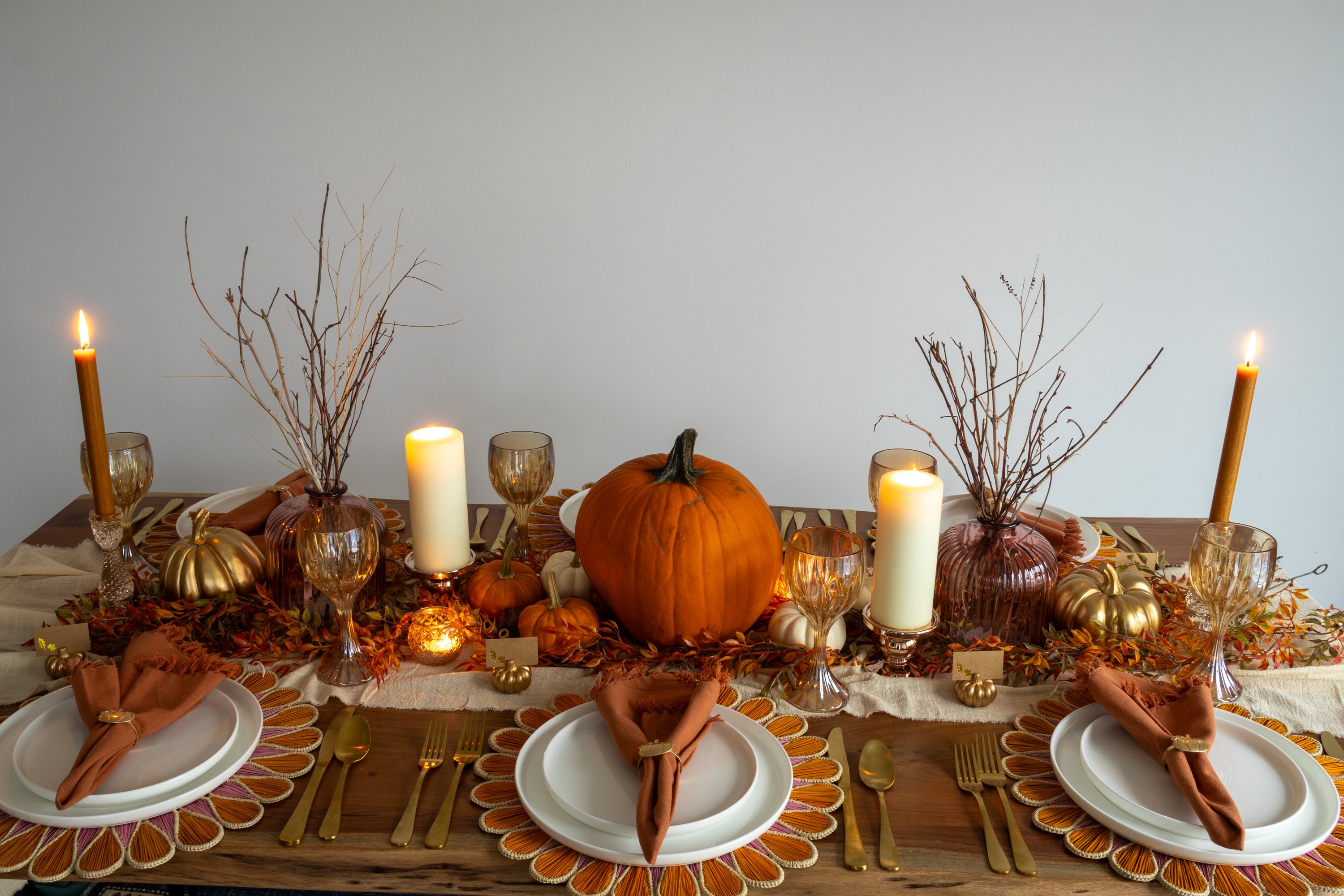A warm autumn setup with pumpkins, soft neutrals, and cozy seasonal accents—perfect for a charming, Thanksgiving-ready tablescape.